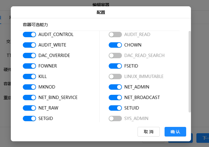 注意在创建时,给予权限要放开NET_ADMIN和NET_BROADCAST