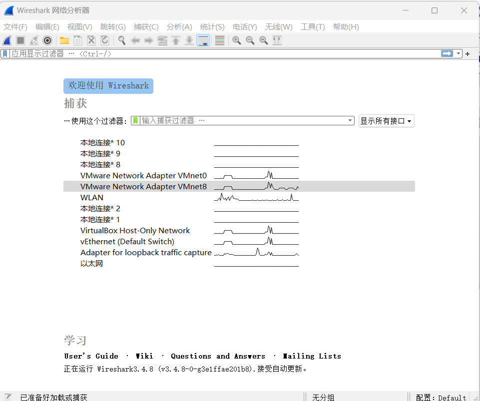 打开后界面如图,下方为选择需要抓取的网卡。上方为过滤器,为了显示指定类型的包