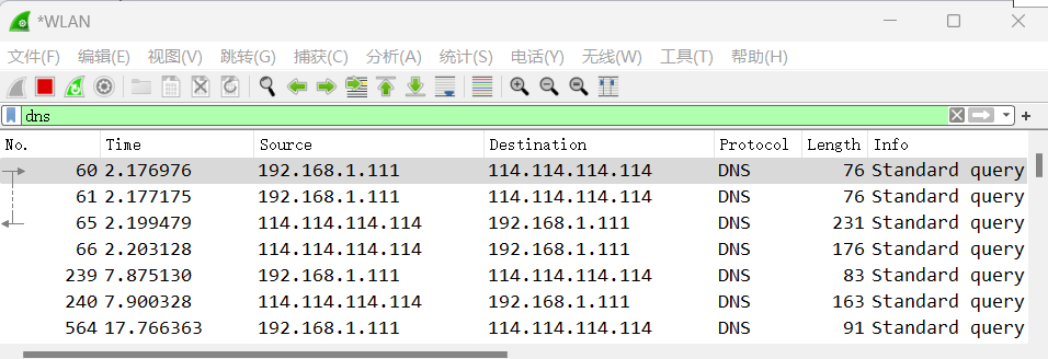 在上方搜索栏输入dns,就可以筛选只显示dns报文