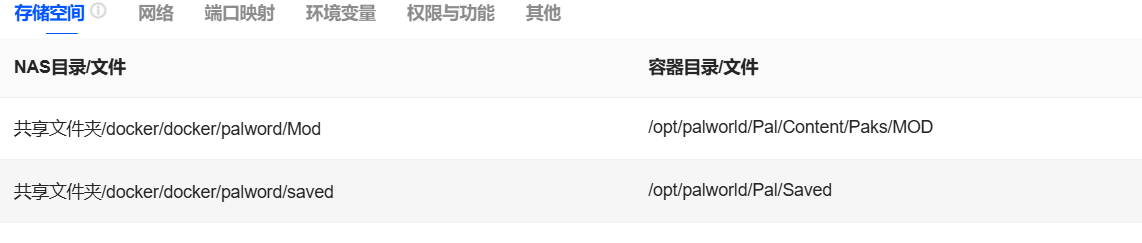 存储:分别挂载两个目录,一个是MOD目录。一个是服务器设置文件所在目录,参数如图
