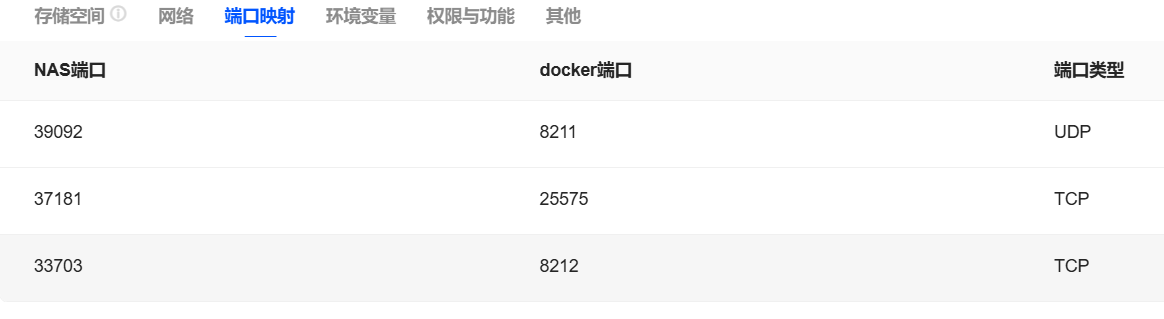 端口映射:网络模式为bright,端口8211为UDP连接端口,25575为RCON端口,8212为RUST api调用端口。